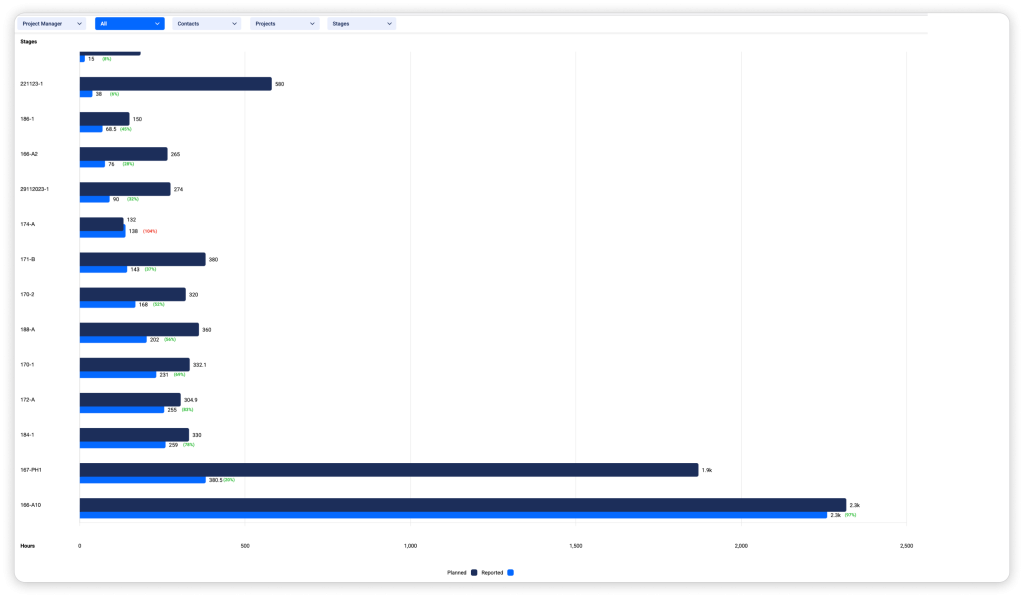 Turn your estimates vs reality into a live scoreboard. At any moment, see how each project, phase, and operation is performing on hours and materials, which ones are at risk, and whatâs repeatedly slowing you down.